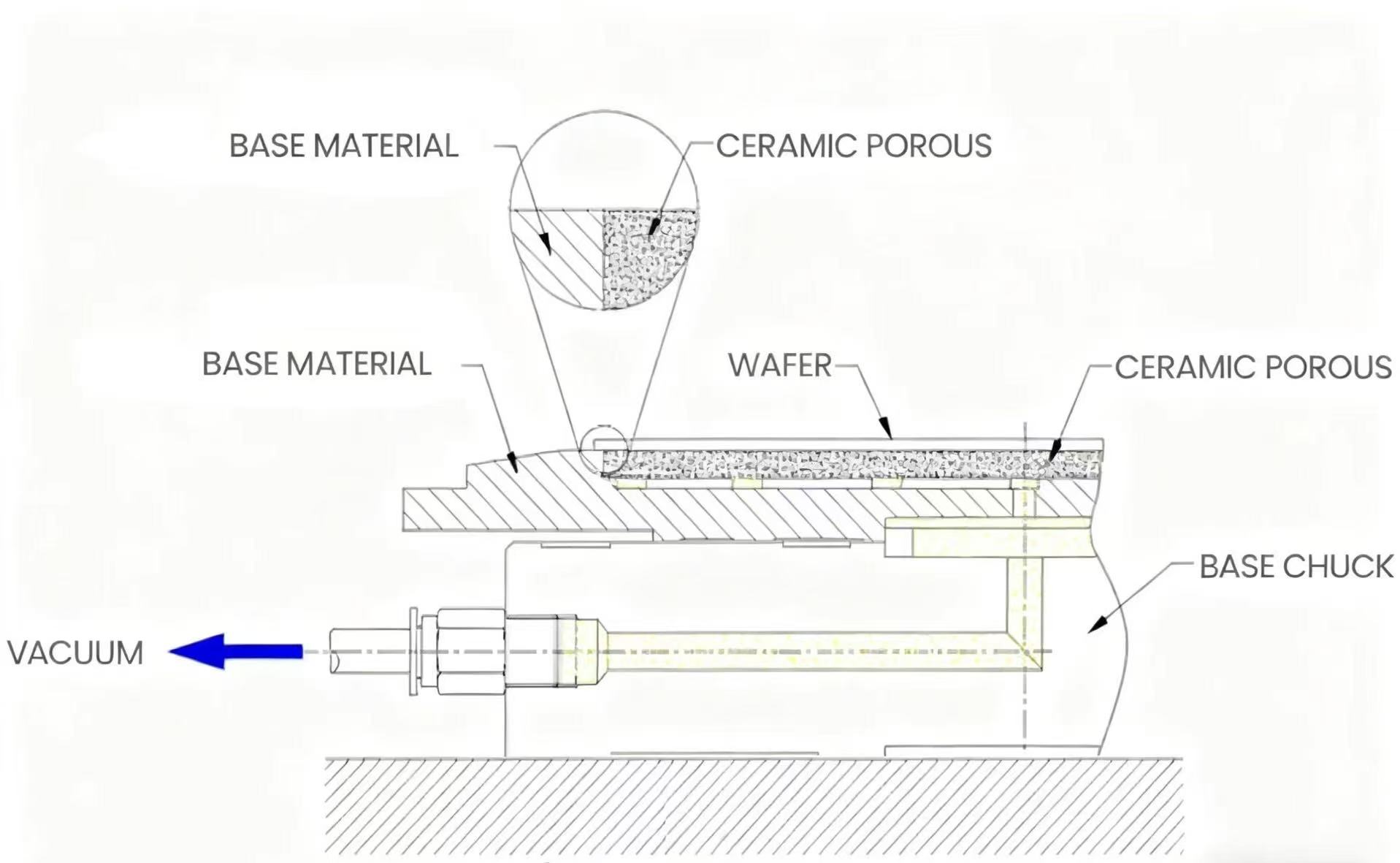 Saincheapthachuck ceirmeach scagachcuimsíonn sé an bonn agus an pláta ceirmeach scagach. Ag nascadh le córas bhfolús, cruthaítear an timpeallacht ísealbhrú tríd an aer idir an wafer agus an ceirmeach a aslonnú. Faoi bhrú diúltach bhfolús, cloítear go daingean leis an dromchla chuck ar an wafer, ar deireadh thiar a bhaint amach fosúchán agus suíomh sábháilte agus cobhsaí.