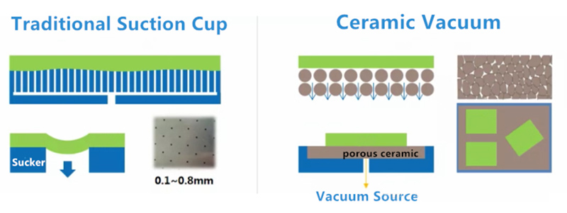 Is ardán é chuck bhfolús ceirmeach scagach a shlánaíonn píosaí oibre trí úsáid a bhaint as prionsabal an asaithe i bhfolús. Is pláta ceirmeach scagach é an chuid aistrithe bhfolús den chuck, a luíonn isteach i bpoll cuntarach sa bhonn. Tá a imlíne nasctha agus séalaithe go dtí an bonn, atá crafted as cruinneas ceirmeach nó miotal. Trí bhonn miotail nó ceirmeach a chomhcheangal le ceirmeach scagach speisialta, agus trí phasáistí aeir inmheánacha beachta a dhearadh, cuirtear brú diúltach ar an chuck, rud a ligeann don phíosa oibre a bheith ceangailte go réidh agus go daingean leis an chuck.