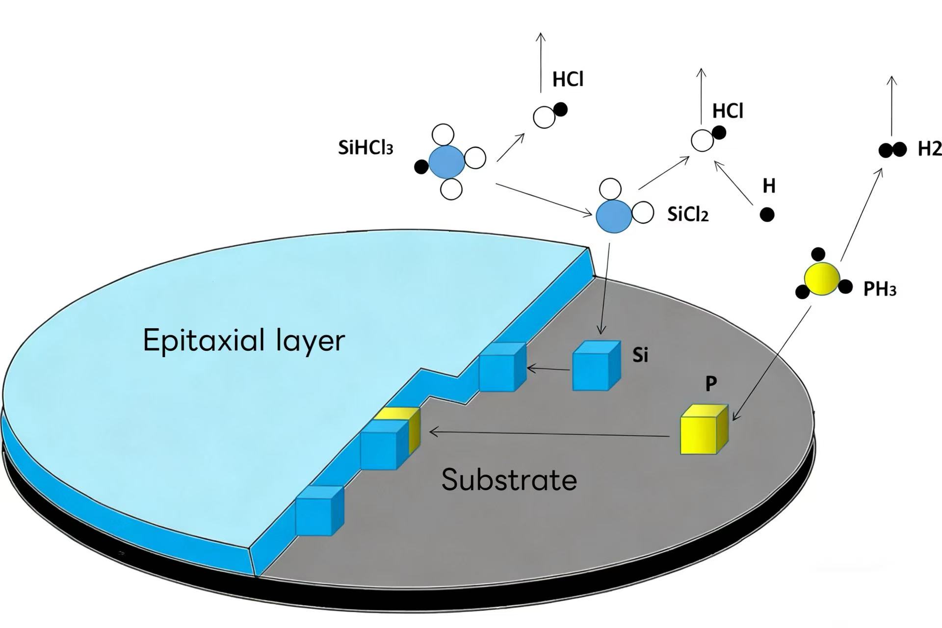 Go ginearálta úsáideann epitaxy sileacain foirnéis epitaxy chéim gaile. Is é a phrionsabal go n-imoibríonn dí-chomhdhéanamh foinse sileacain (cosúil le silane, dichlorosilane, trichlorosilane, agus teitreaclóiríd sileacain le hidrigin chun sileacain a ghiniúint. Le linn fáis, is féidir gáis dópála cosúil le PH₃ agus B₂H₆ a thabhairt isteach ag an am céanna. Tá an tiúchan dópála á rialú go beacht ag an ngás brú páirteach chun ciseal epitaxial sonrach a fhoirmiú le ciseal friotaíoch ar leith.